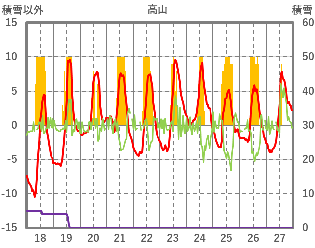 | 日 | 時 | 気温 | 降水 | 風向/風速 | 日照 | 積雪 | 降雪 |