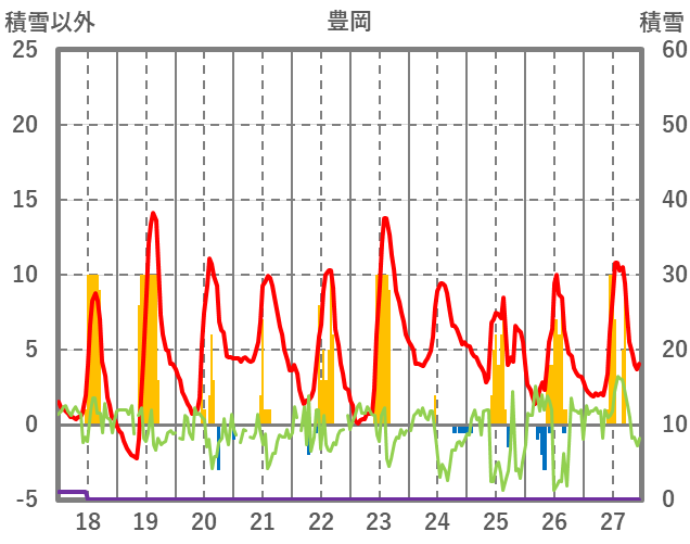 | 日 | 時 | 気温 | 降水 | 風向/風速 | 日照 | 積雪 | 降雪 |