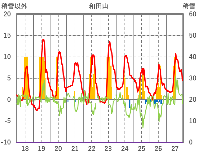 | 日 | 時 | 気温 | 降水 | 風向/風速 | 日照 | 積雪 | 降雪 |