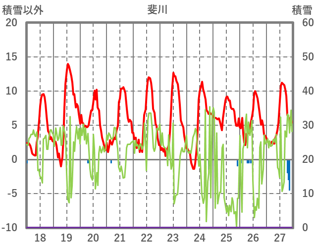 | 日 | 時 | 気温 | 降水 | 風向/風速 | 日照 | 積雪 | 降雪 |