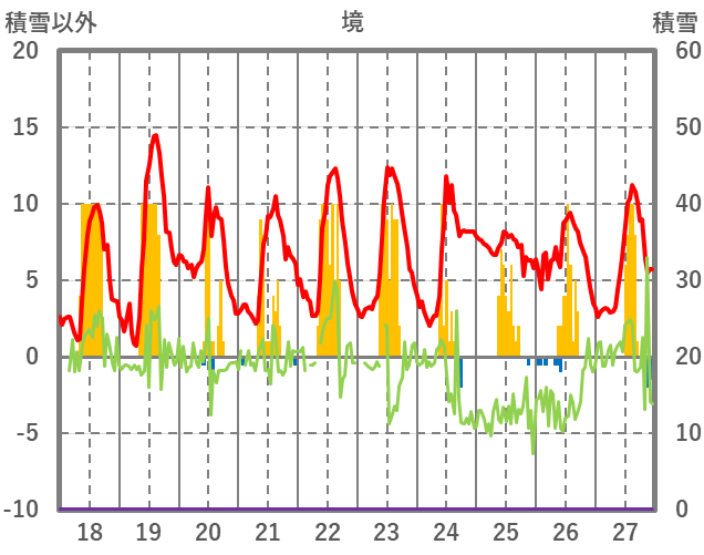 | 日 | 時 | 気温 | 降水 | 風向/風速 | 日照 | 積雪 | 降雪 |