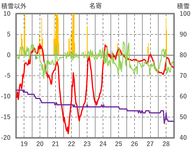 | 日 | 時 | 気温 | 降水 | 風向/風速 | 日照 | 積雪 | 降雪 |