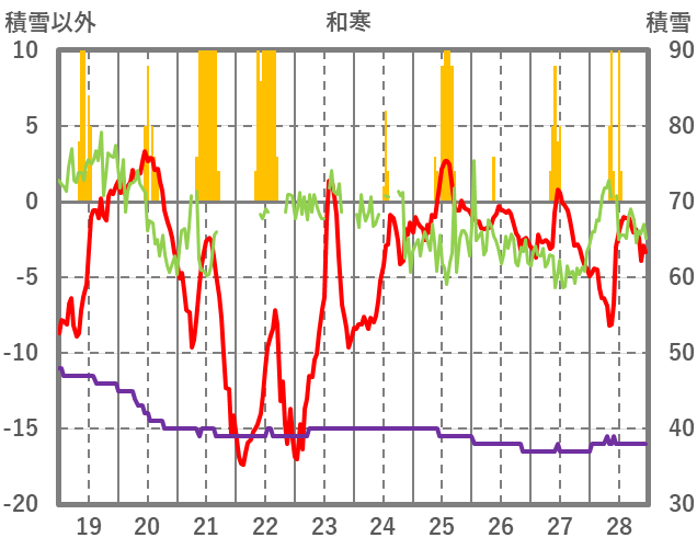 | 日 | 時 | 気温 | 降水 | 風向/風速 | 日照 | 積雪 | 降雪 |