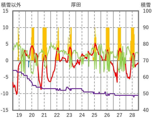 | 日 | 時 | 気温 | 降水 | 風向/風速 | 日照 | 積雪 | 降雪 |