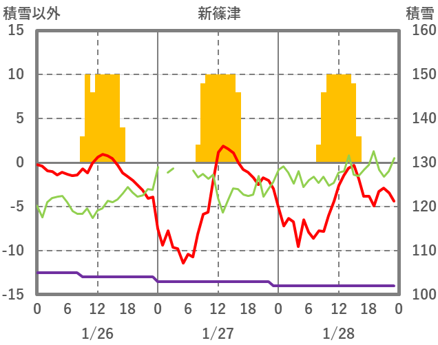 | 日 | 時 | 気温 | 降水 | 風向/風速 | 日照 | 積雪 | 降雪 |