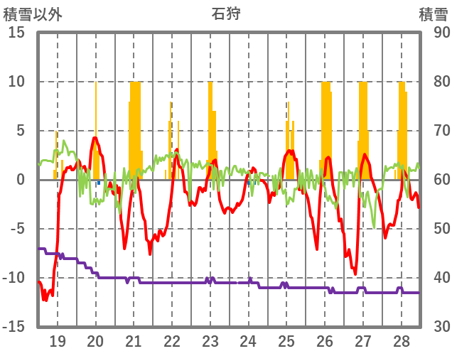 | 日 | 時 | 気温 | 降水 | 風向/風速 | 日照 | 積雪 | 降雪 |