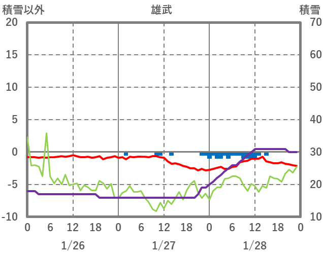 | 日 | 時 | 気温 | 降水 | 風向/風速 | 日照 | 積雪 | 降雪 |