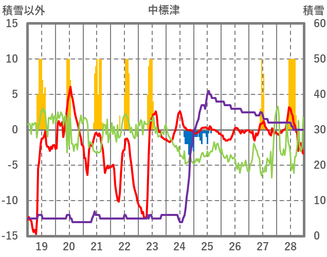 | 日 | 時 | 気温 | 降水 | 風向/風速 | 日照 | 積雪 | 降雪 |