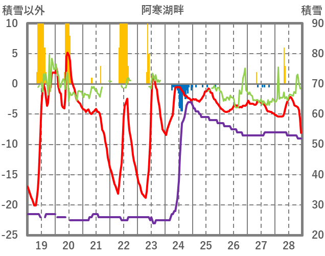 | 日 | 時 | 気温 | 降水 | 風向/風速 | 日照 | 積雪 | 降雪 |