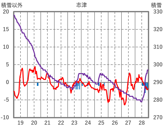 | 日 | 時 | 気温 | 降水 | 風向/風速 | 日照 | 積雪 | 降雪 |