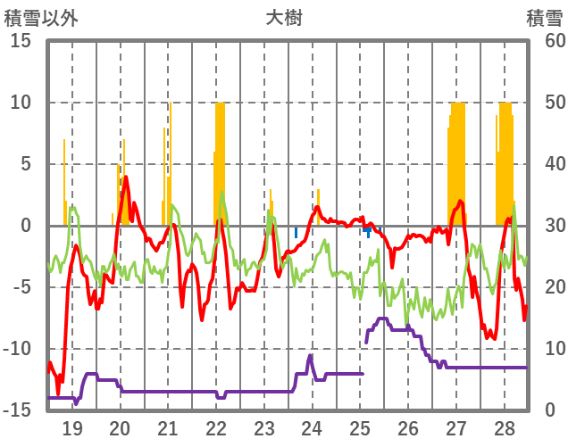 | 日 | 時 | 気温 | 降水 | 風向/風速 | 日照 | 積雪 | 降雪 |