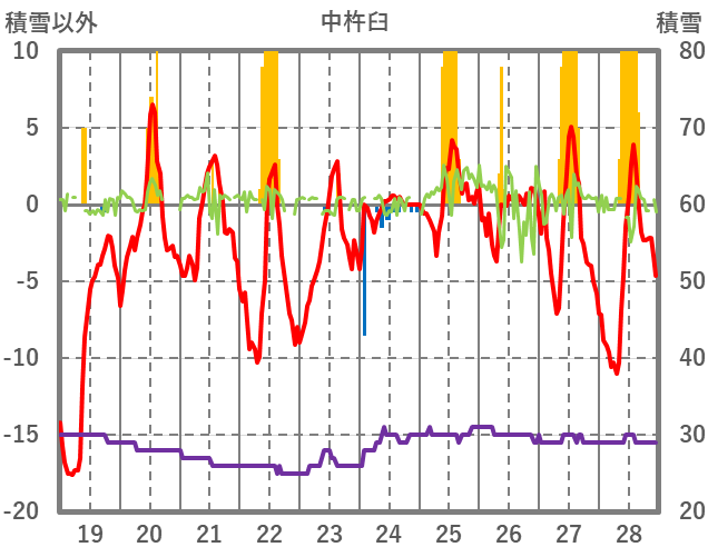 | 日 | 時 | 気温 | 降水 | 風向/風速 | 日照 | 積雪 | 降雪 |