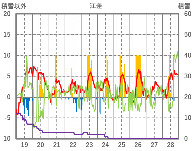 | 日 | 時 | 気温 | 降水 | 風向/風速 | 日照 | 積雪 | 降雪 |