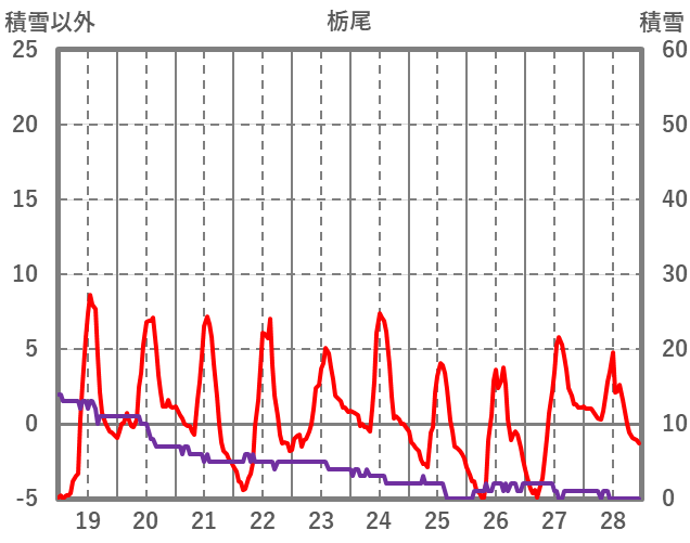 | 日 | 時 | 気温 | 降水 | 風向/風速 | 日照 | 積雪 | 降雪 |