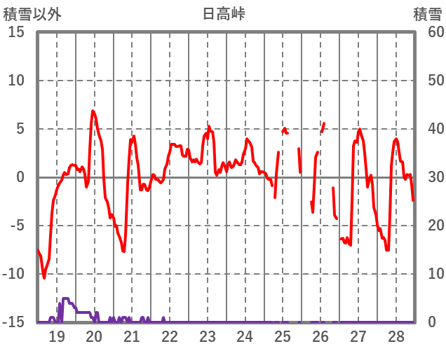 | 日 | 時 | 気温 | 降水 | 風向/風速 | 日照 | 積雪 | 降雪 |