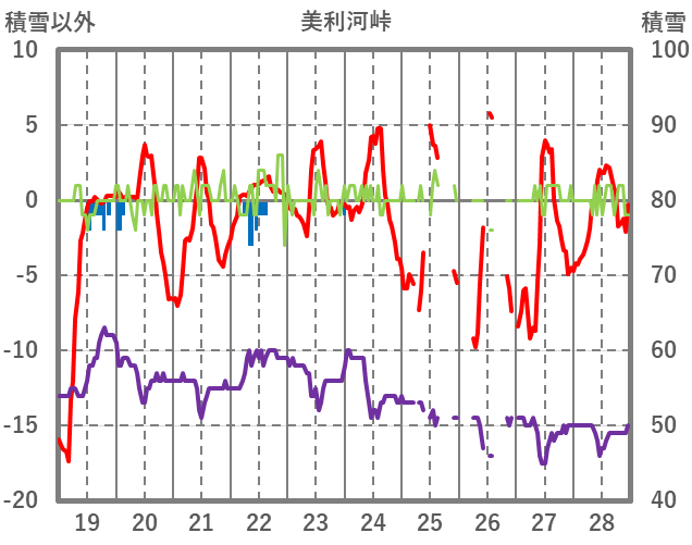 | 日 | 時 | 気温 | 降水 | 風向/風速 | 日照 | 積雪 | 降雪 |