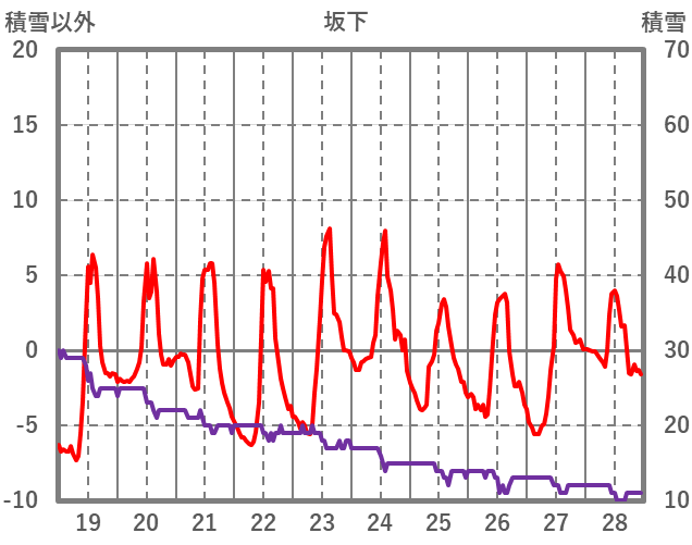 | 日 | 時 | 気温 | 降水 | 風向/風速 | 日照 | 積雪 | 降雪 |