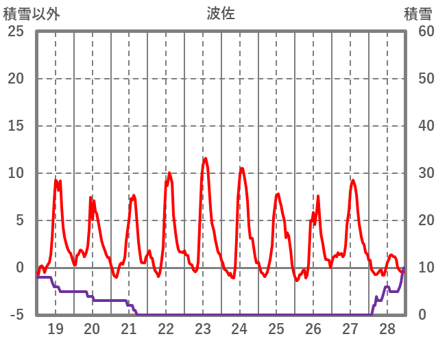 | 日 | 時 | 気温 | 降水 | 風向/風速 | 日照 | 積雪 | 降雪 |