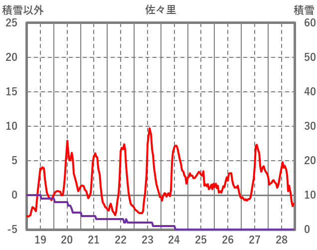 | 日 | 時 | 気温 | 降水 | 風向/風速 | 日照 | 積雪 | 降雪 |