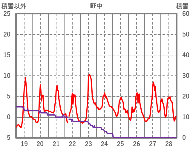 | 日 | 時 | 気温 | 降水 | 風向/風速 | 日照 | 積雪 | 降雪 |