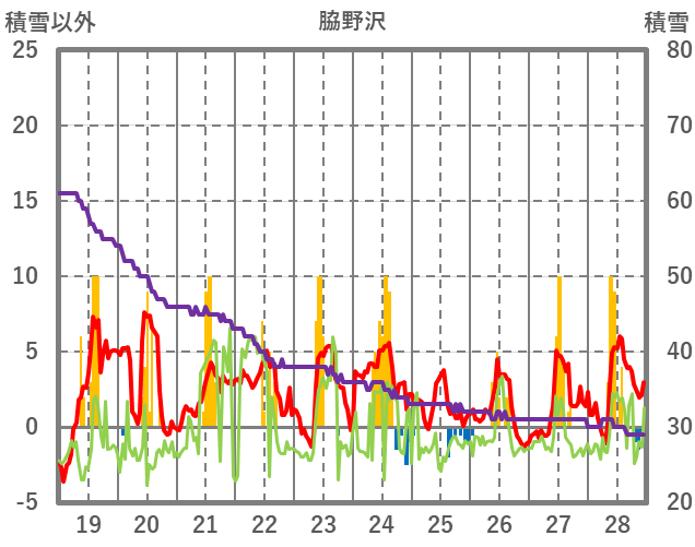 | 日 | 時 | 気温 | 降水 | 風向/風速 | 日照 | 積雪 | 降雪 |