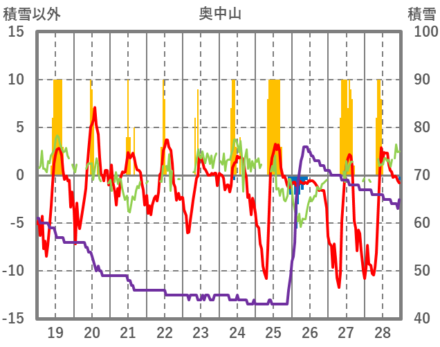 | 日 | 時 | 気温 | 降水 | 風向/風速 | 日照 | 積雪 | 降雪 |