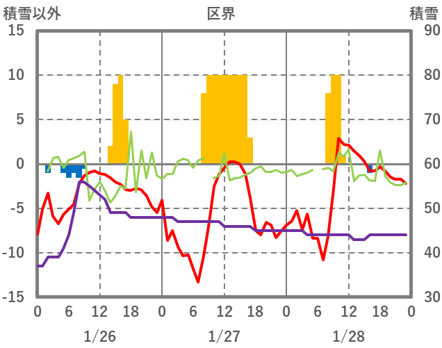 | 日 | 時 | 気温 | 降水 | 風向/風速 | 日照 | 積雪 | 降雪 |