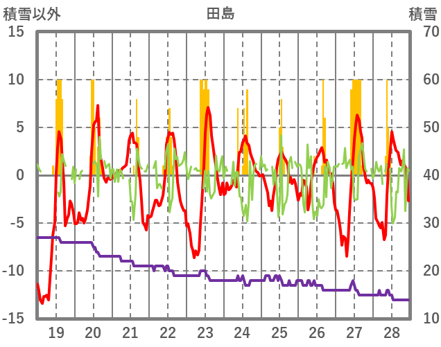 | 日 | 時 | 気温 | 降水 | 風向/風速 | 日照 | 積雪 | 降雪 |