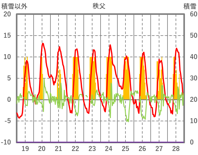 | 日 | 時 | 気温 | 降水 | 風向/風速 | 日照 | 積雪 | 降雪 |