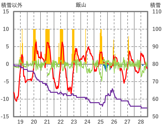 | 日 | 時 | 気温 | 降水 | 風向/風速 | 日照 | 積雪 | 降雪 |