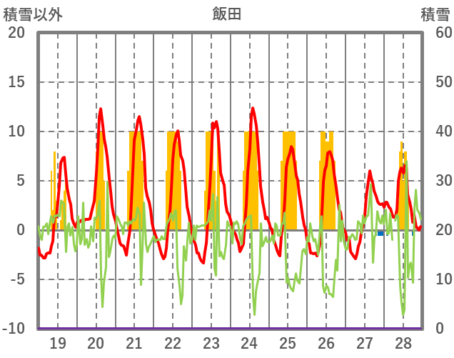 | 日 | 時 | 気温 | 降水 | 風向/風速 | 日照 | 積雪 | 降雪 |