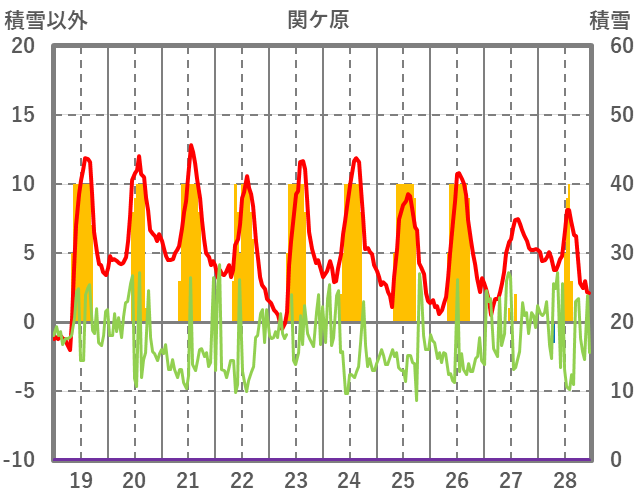 | 日 | 時 | 気温 | 降水 | 風向/風速 | 日照 | 積雪 | 降雪 |
