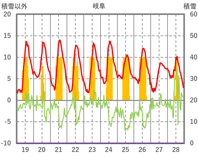 | 日 | 時 | 気温 | 降水 | 風向/風速 | 日照 | 積雪 | 降雪 |