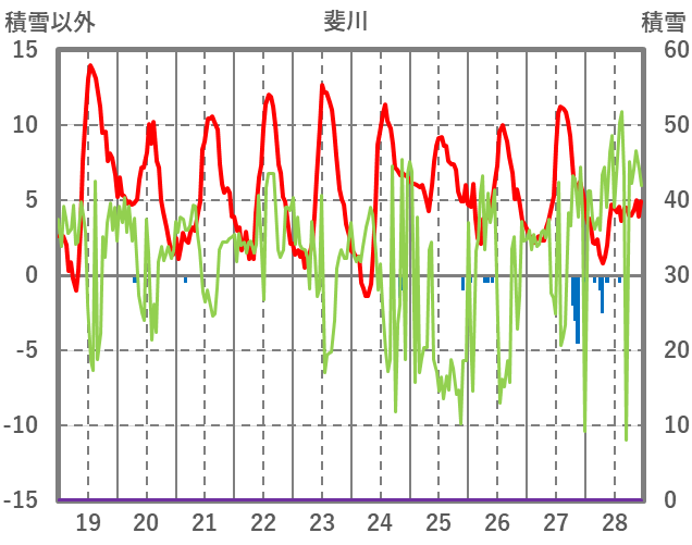 | 日 | 時 | 気温 | 降水 | 風向/風速 | 日照 | 積雪 | 降雪 |
