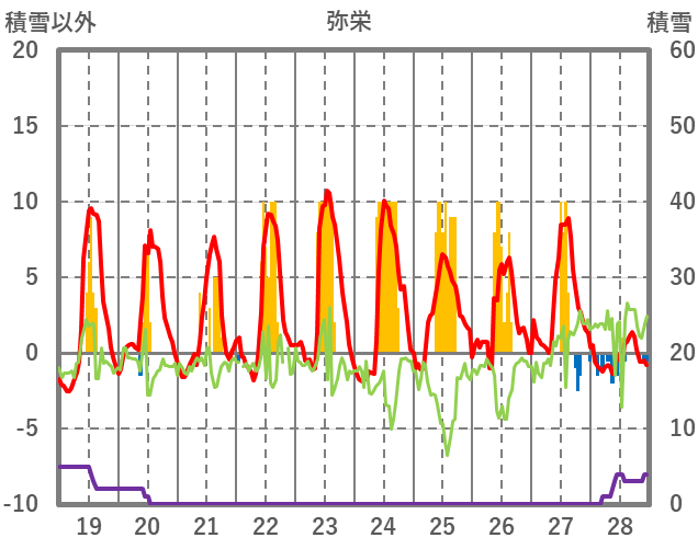 | 日 | 時 | 気温 | 降水 | 風向/風速 | 日照 | 積雪 | 降雪 |