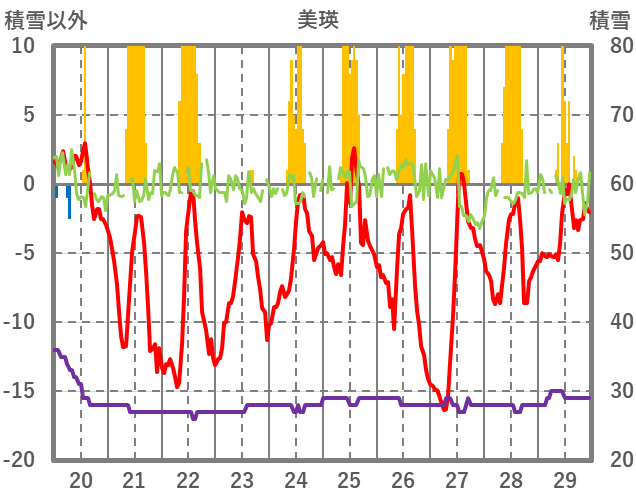 | 日 | 時 | 気温 | 降水 | 風向/風速 | 日照 | 積雪 | 降雪 |