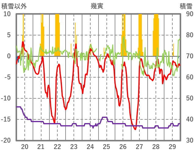 | 日 | 時 | 気温 | 降水 | 風向/風速 | 日照 | 積雪 | 降雪 |