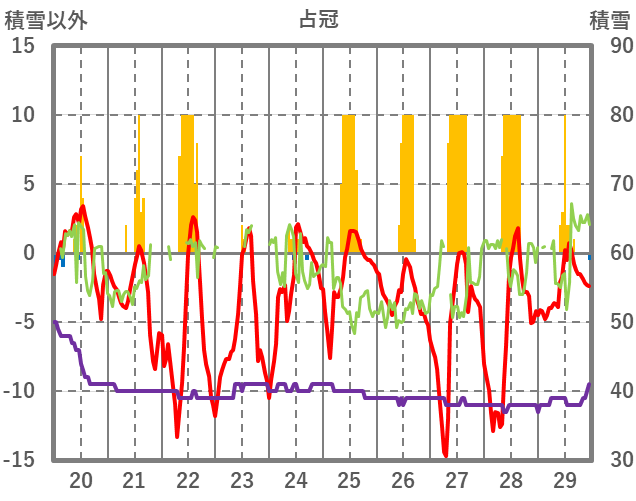 | 日 | 時 | 気温 | 降水 | 風向/風速 | 日照 | 積雪 | 降雪 |