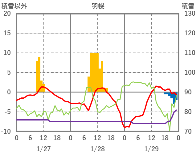 | 日 | 時 | 気温 | 降水 | 風向/風速 | 日照 | 積雪 | 降雪 |