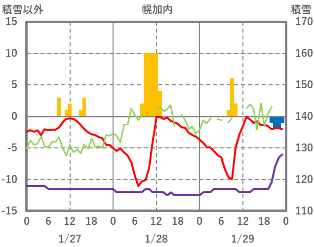 | 日 | 時 | 気温 | 降水 | 風向/風速 | 日照 | 積雪 | 降雪 |
