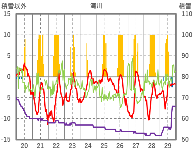 | 日 | 時 | 気温 | 降水 | 風向/風速 | 日照 | 積雪 | 降雪 |