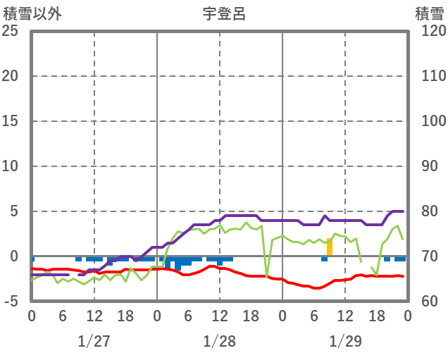 | 日 | 時 | 気温 | 降水 | 風向/風速 | 日照 | 積雪 | 降雪 |