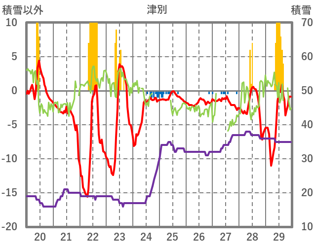 | 日 | 時 | 気温 | 降水 | 風向/風速 | 日照 | 積雪 | 降雪 |
