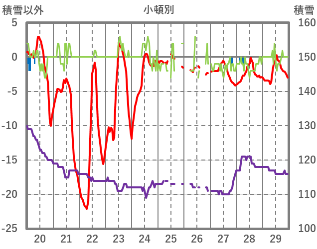 | 日 | 時 | 気温 | 降水 | 風向/風速 | 日照 | 積雪 | 降雪 |