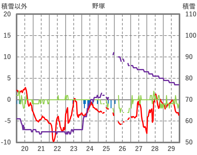 | 日 | 時 | 気温 | 降水 | 風向/風速 | 日照 | 積雪 | 降雪 |