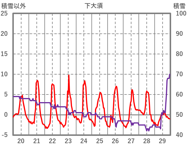 | 日 | 時 | 気温 | 降水 | 風向/風速 | 日照 | 積雪 | 降雪 |