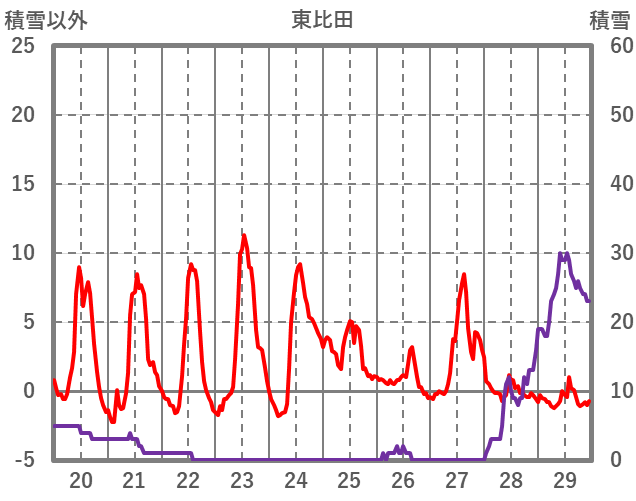 | 日 | 時 | 気温 | 降水 | 風向/風速 | 日照 | 積雪 | 降雪 |