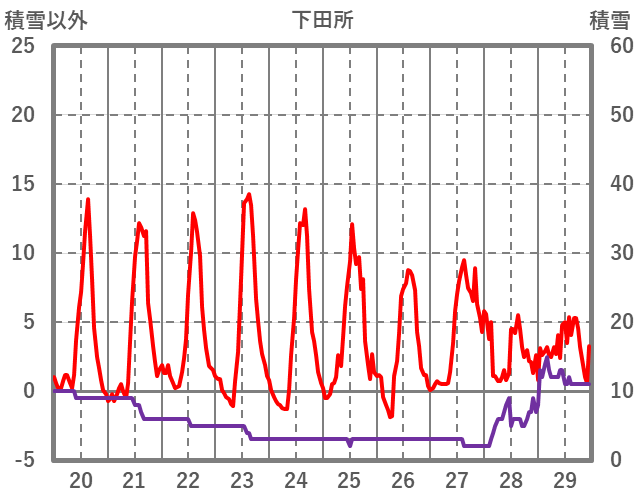 | 日 | 時 | 気温 | 降水 | 風向/風速 | 日照 | 積雪 | 降雪 |