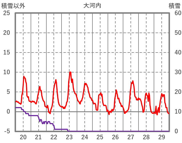 | 日 | 時 | 気温 | 降水 | 風向/風速 | 日照 | 積雪 | 降雪 |