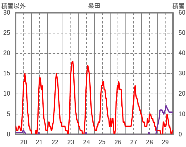 | 日 | 時 | 気温 | 降水 | 風向/風速 | 日照 | 積雪 | 降雪 |